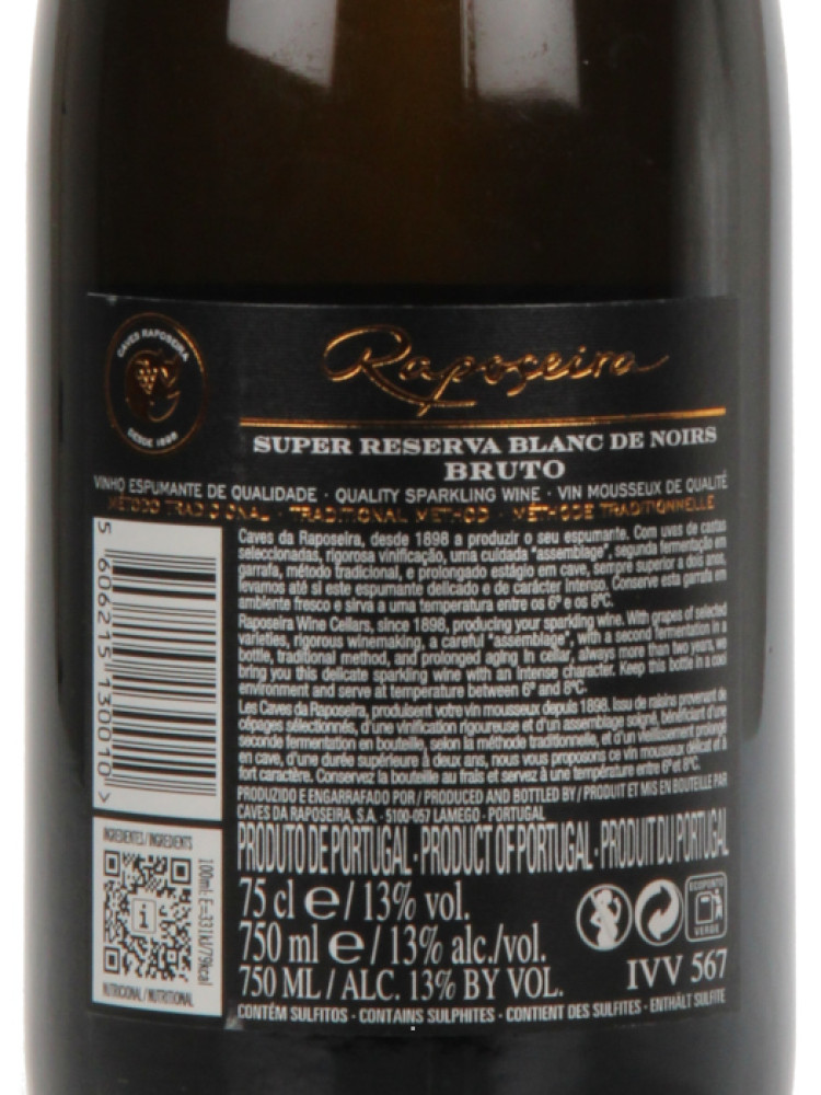 O Espumante Raposeira Super Reserva Blanc de Noirs Bruto é um espumante 100% Touriga Franca com cor Citrina Clara, no aroma é frutado intenso e no sabor têm caratcteristicas bruto com acidez e equilibrado.