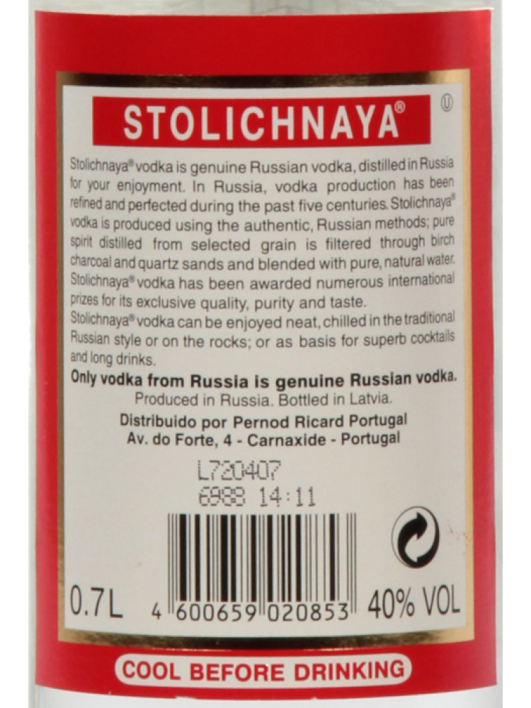 Sobre: A vodka Stolichnaya é vodka genuína russa. Destilada na Rússia seguindo métodos de produção que têm vindo a ser aperfeiçoados nos últimos cinco séculos.