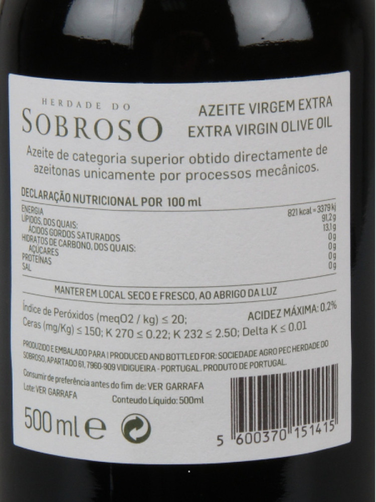 Produzido e embalado por: Sociedade Agro Pecuária Herdade do Sobroso