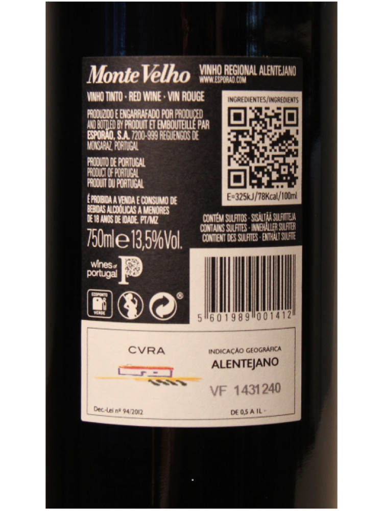 O Esporão Monte Velho Tinto é um vinho de cor rubi. Aroma delicado e intenso a fruta vermelha silvestre, com nuances resinosas. Boca equilibrada, fresca, com taninos suaves que proporciona um final de boca elegante e com garra.