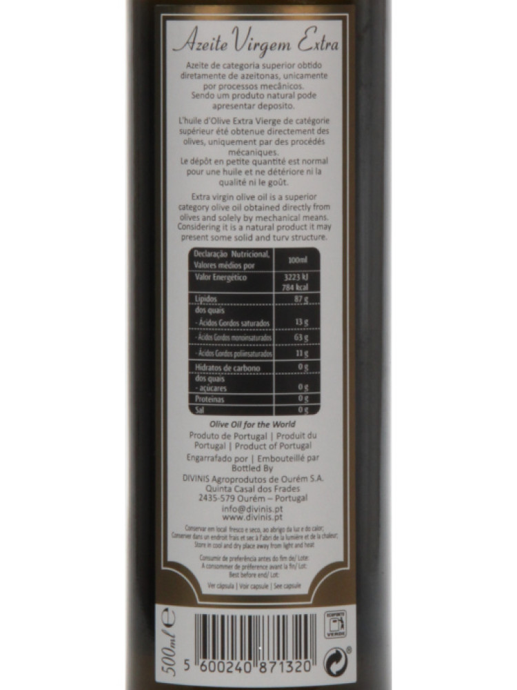 O Azeite virgem extra Conde de Ourém é azeite de Categoria Superior obtido diretamente de azeitonas, unicamente por processos mecânicos. Sendo um produto 100% natural pode apresentar depósito.