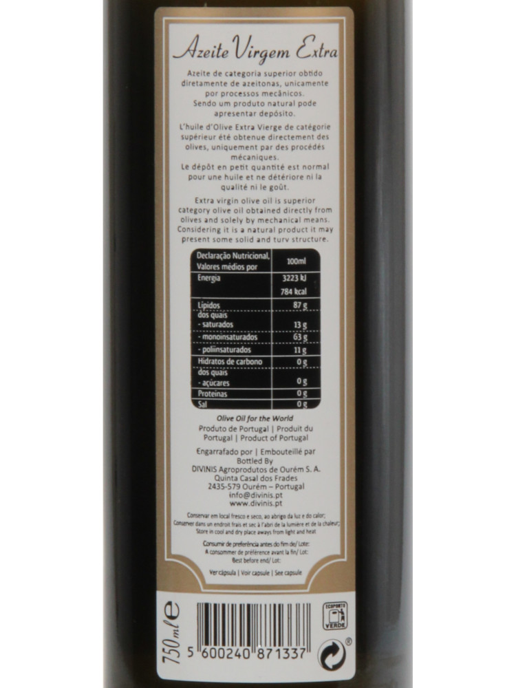 O Azeite virgem extra Conde de Ourém é azeite de Categoria Superior obtido diretamente de azeitonas, unicamente por processos mecânicos. Sendo um produto 100% natural pode apresentar depósito.